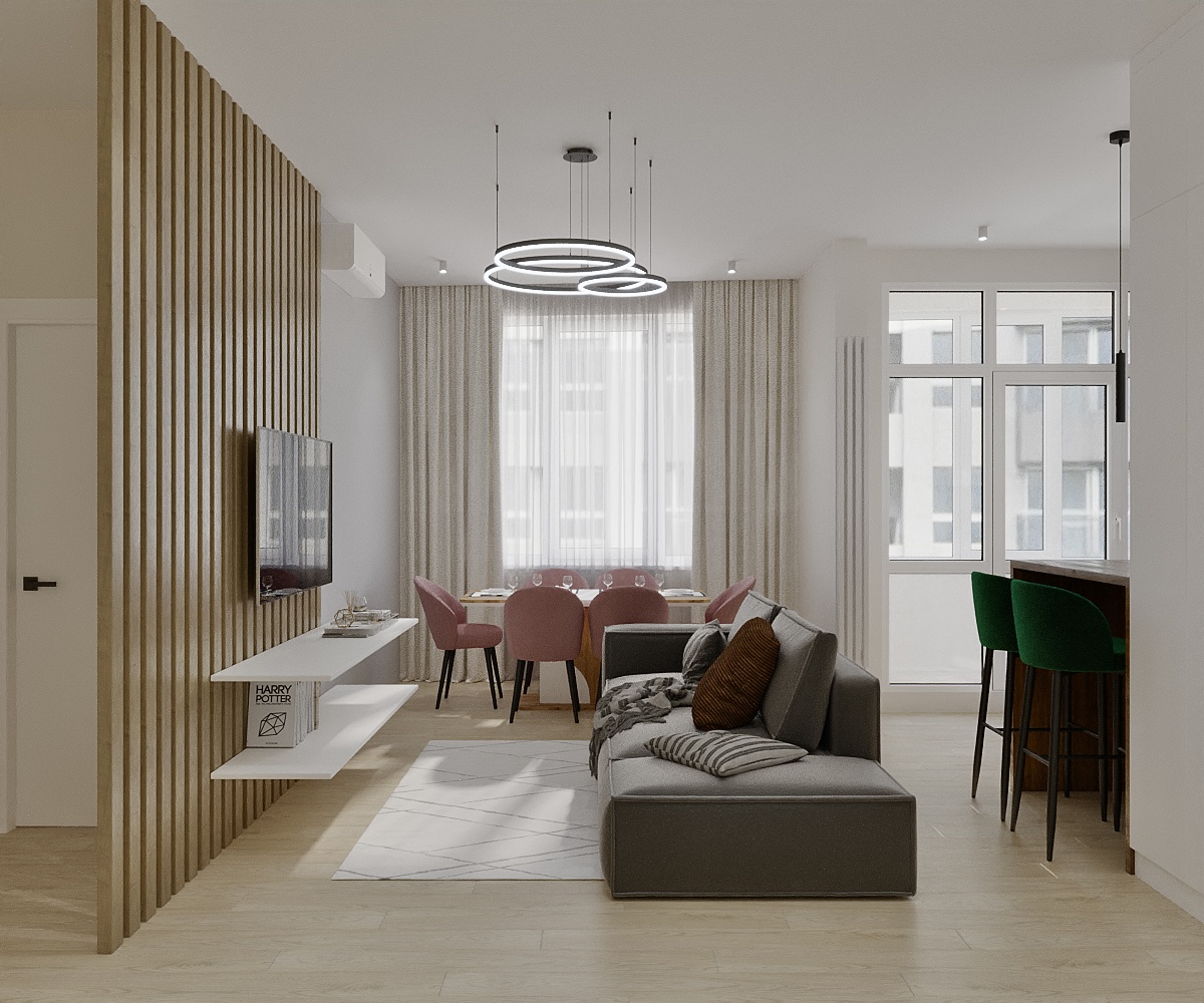 Следующая трешка площадью 70,5 метра оформлена в стиле современная классика: в светлых тонах и с использованием нежного бирюзового цвета разных оттенков.