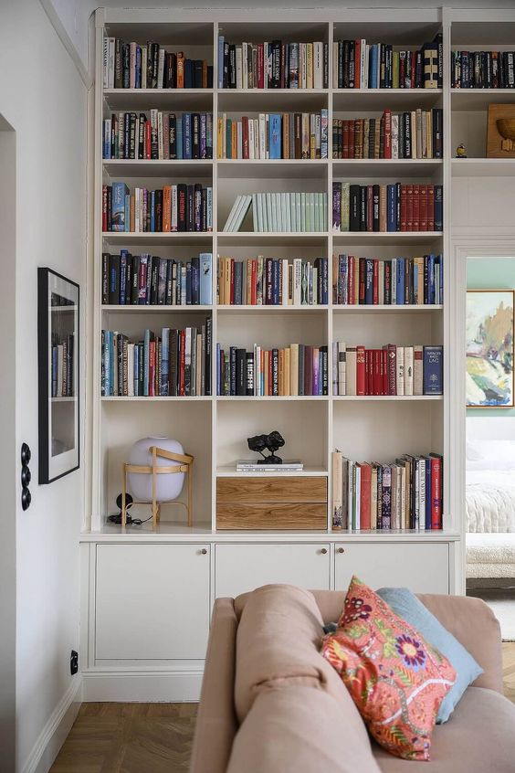 Так, если библиотека действительно большая, под нее требуется отдельная комната — она же будет служить кабинетом. Но чаще всего такой возможности нет, поэтому приходится изобретать велосипед: отводить под книги зону у акцентной стены в гостиной или спальне, играть с вариациями, где книжный шкаф делит собою помещение на две зоны (особенно актуально для студий), или пытаться разместить книги в неожиданном месте — например в коридоре.