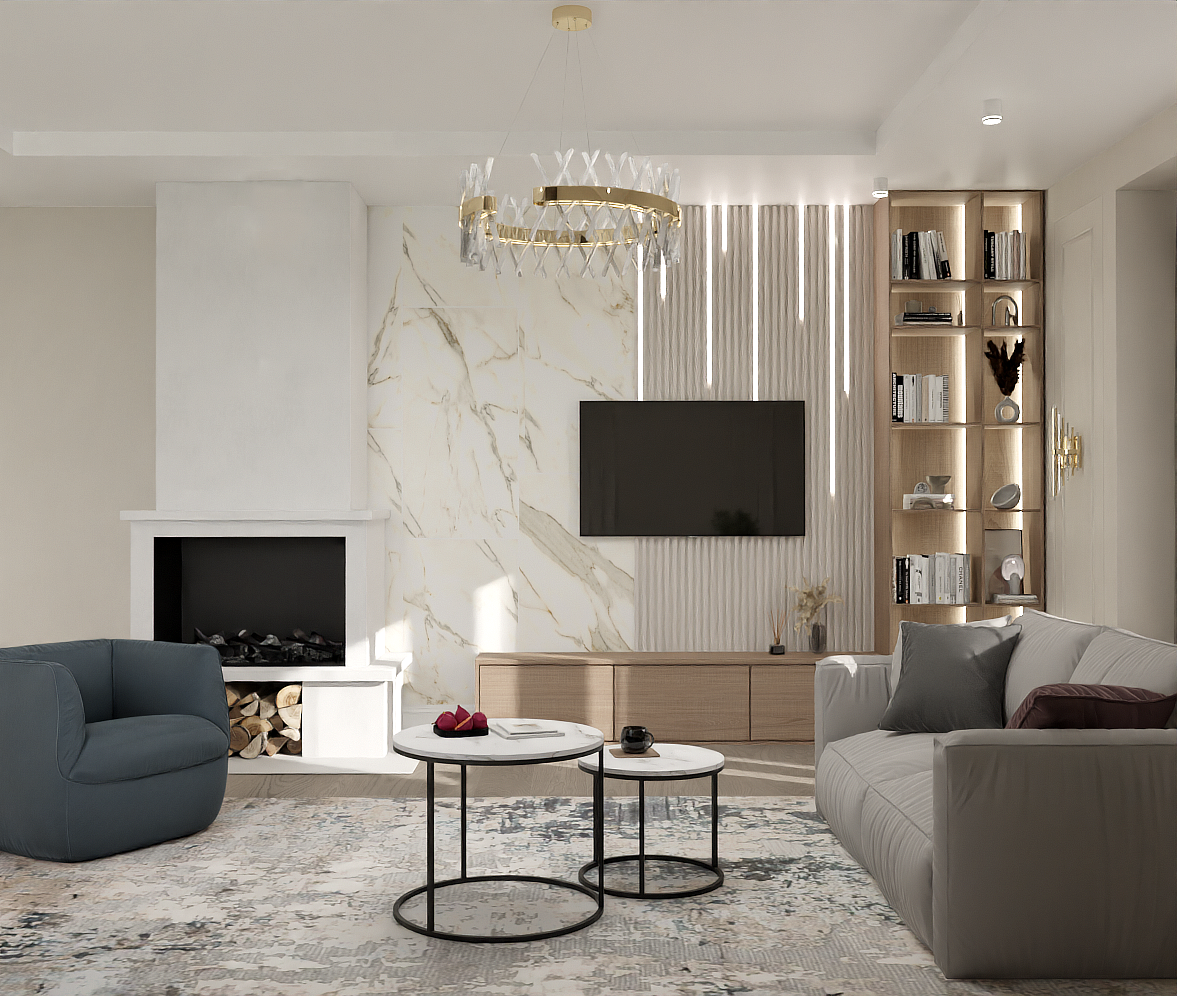 1. Современная гостиная с камином