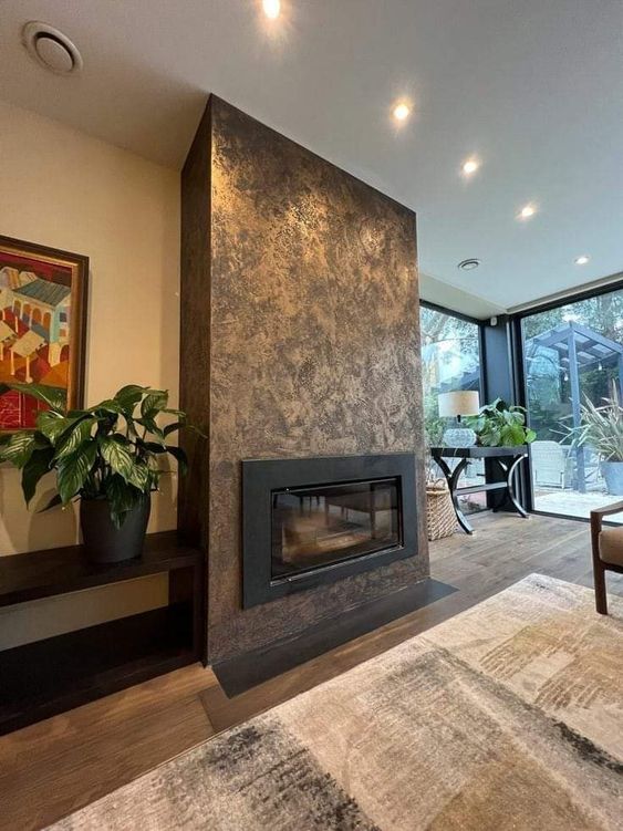 Фасад камина можно сделать медным. Подобную конструкцию получится создать при помощи ниши из гипсокартона и медных пластин либо керамической плитки в соответствующих оттенках. Медно-огненный коктейль выглядит очень стильно и придает характеру интерьера брутальности. Эта идея также подойдет, если необходимо органично вписать фальшкамин или электрический камин в интерьер гостиной: смотрится очень стильно.