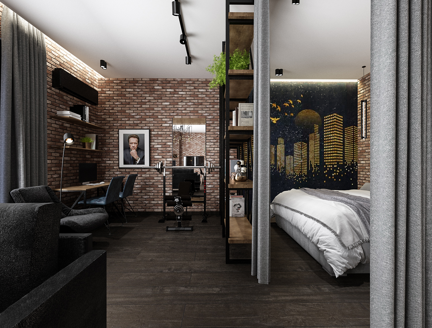 В спальне кирпичная стена прекрасно расположится над изголовьем кровати. Чтобы интерьер не получился слишком грубым и прохладным, уравновесьте фактуру кирпича мягким текстилем, легкими занавесками и ковром.