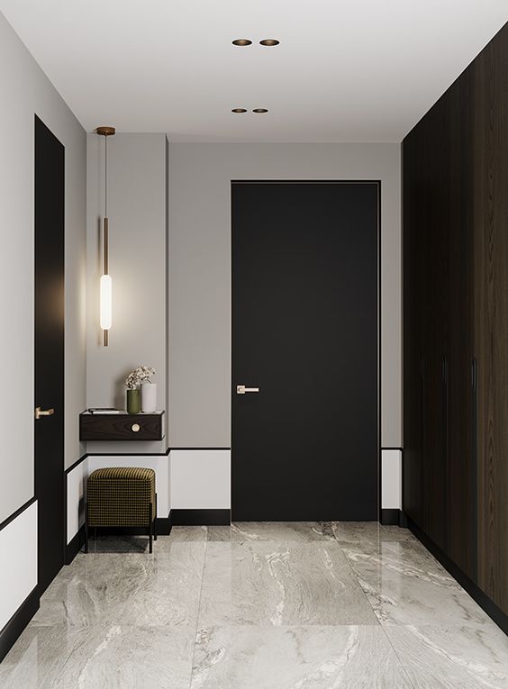 При использовании светлых полов и темных дверей с такими же наличниками получится очень оригинальный и даже эксцентричный дизайн проект интерьера в Москве. Особенно если выполнить светлую отделку стен, чтобы темная дверь максимально выделялась и контрастировала. Цвет пола может совпадать со стенами или быть на пару тонов темнее.