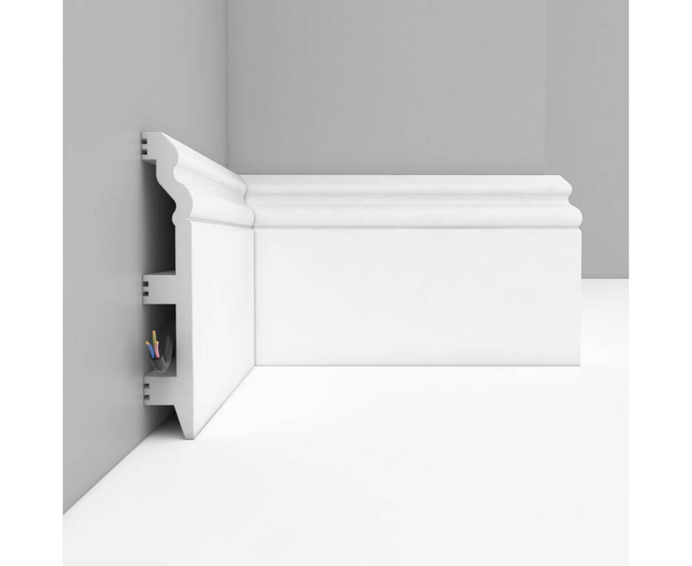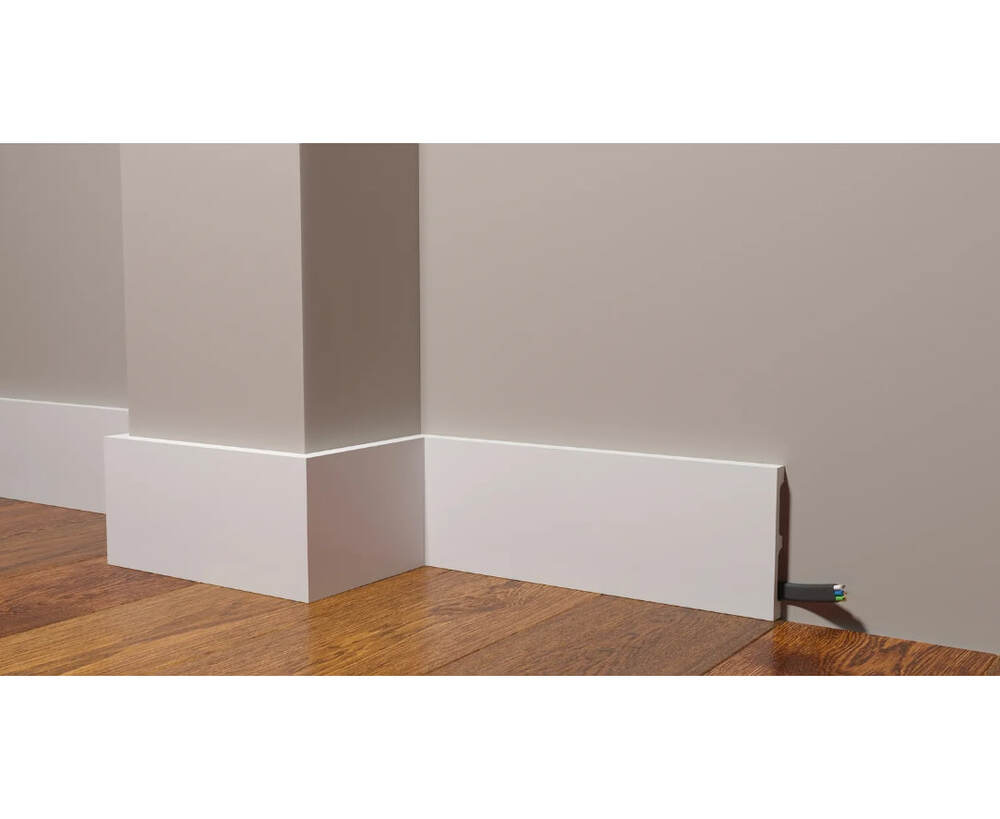 Так вы создадите в комнате умеренный визуальный контраст, который оживит ее интерьер и избавит от монотонности красок. Эффект контрастности можно подчеркнуть, если использовать плинтус в цвет стен — таких же светлых и выделяющихся на фоне темной двери и пола. Главное правило: ширина плинтусов должна быть достаточно большой (не менее 8 см), чтобы они могли оказать влияние на общую палитру и выделиться даже на фоне однотонной стеновой отделки.