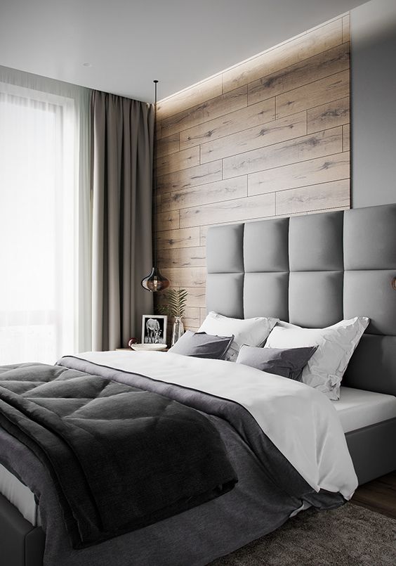 Мягкая акцентная стена станет хорошей заменой изголовью кровати, так как у вас будет приятная на ощупь поверхность, на которую удобно облокотиться. Чтобы интерьер спальни выглядел завершенным, мы советуем повторить расцветку или узор текстиля в других элементах декора, например в постельном белье, обивке кресел или оттоманки.