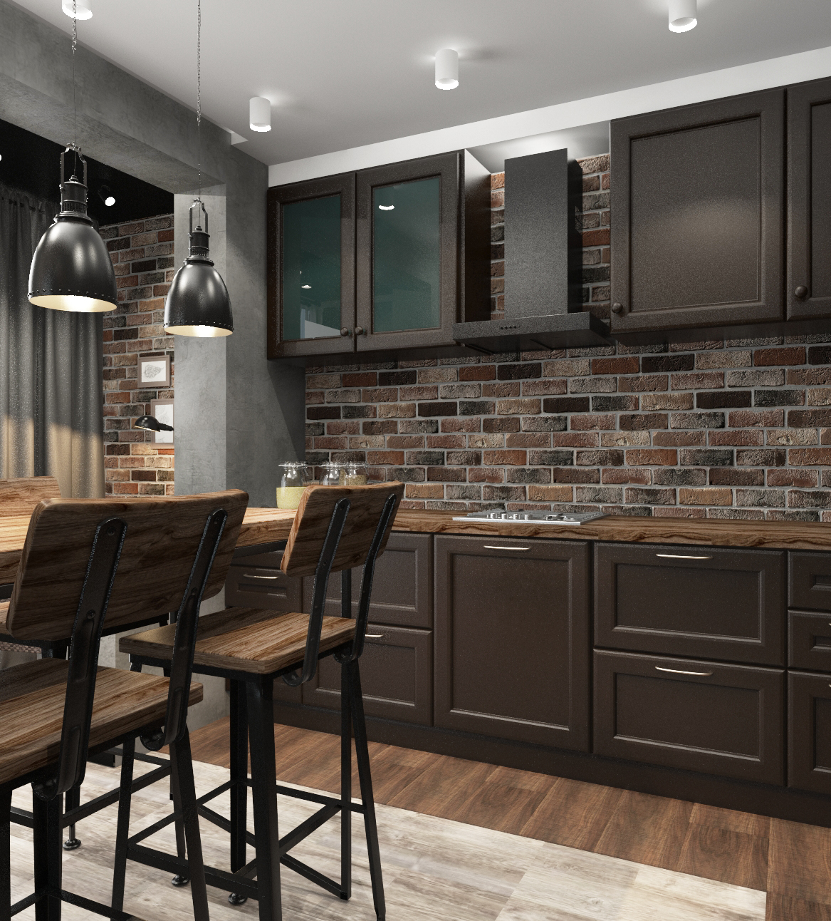 Еще один способ применить кирпич на кухне — сделать перегородку для зонирования пространства. Это отличный вариант для совмещенных помещений и для студий.