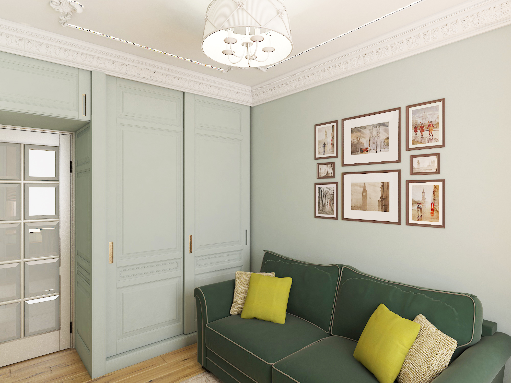 В студии с высокими потолками изящно будут смотреться потолки с лепниной — с их помощью можно зонировать пространство. При выборе материала отдавайте предпочтение гипсу — он имеет экологически чистый и натуральный состав. Стены лучше всего сделать одного цвета с потолком.