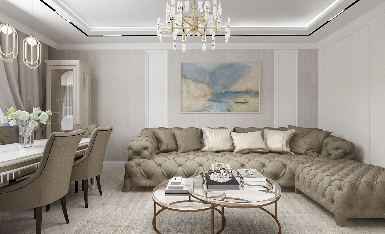 Шикарно оформленный лепниной потолок нуждается в шикарной люстре, которая станет акцентом вашей комнаты. Такой интерьер не стоит излишне загромождать яркими цветами и мебелью. При таком потолке минималистичный стеклянный столик и диван с простым дизайном — то что нужно.