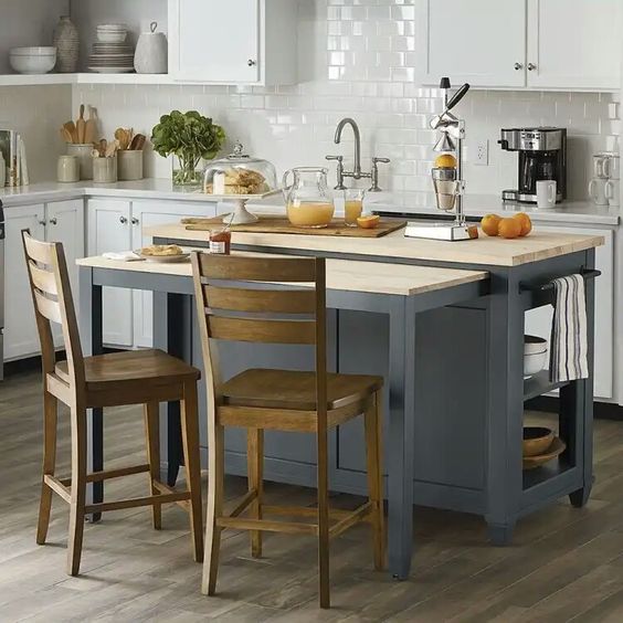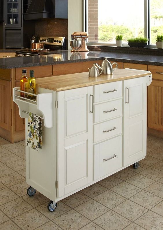 В крохотных кухнях, квартирах-студиях или объединенных со столовыми гостиных прекрасно разместится мобильный остров на колесиках. Его можно легко установить рядом с плитой и использовать в качестве разделочной поверхности, а в нужный момент перевезти в столовую зону, где он быстро перевоплотится в сервировочный столик.