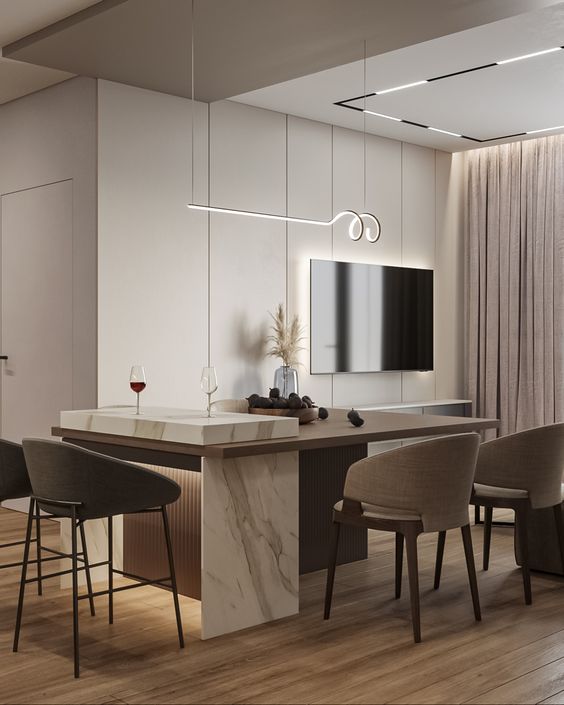 Остров в виде барной стойки — отличное решение для обустройства современного интерьера в студиях или объединенных кухнях-гостиных. Такая модель не только заменит громоздкий обеденный стол, но и четко зонирует пространство без лишних перегородок.
