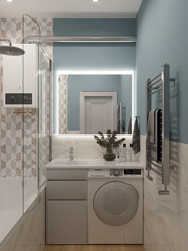 Приборы для укладки волос — тоже не лучший декор для ванной. Их можно хранить в потайном ящике прямо под раковиной, закрытом узкой откидной панелью. В самом шкафу организуйте полку — она разделит небольшое пространство, на котором, рационально используя каждый сантиметр, можно поместить несколько открытых корзин для гигиенических средств.
