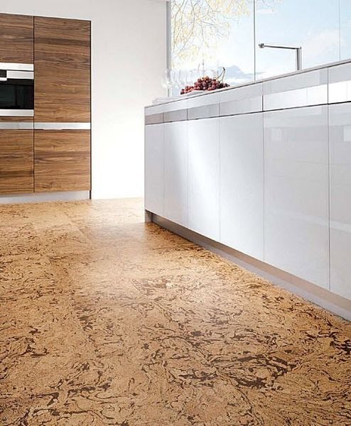Натуральный материал, который украсит любой интерьер благодаря обилию цветов и текстур. Дешевле натуральной древесины, но с аналогичными декоративными качествами и экологичностью. Для кухни пробковый пол, покрытый лаком, будет отличным решением, так как он прекрасно моется и не боится пятен. Наиболее органично будет смотреться с деревянной мебелью, но можно пробковое покрытие применять и в других стилях, создавая необычный дизайн.