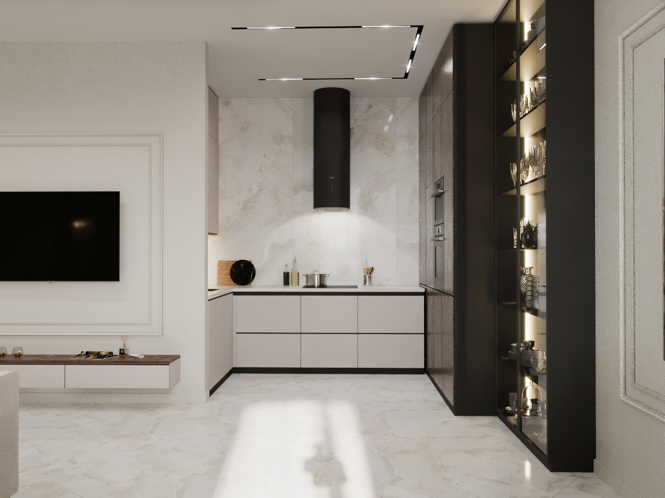 Мраморные обои выглядят стильно и подходят для современных интерьеров. Если вы подберете столешницы из такого же материала, интерьер будет производить незабываемое впечатление.