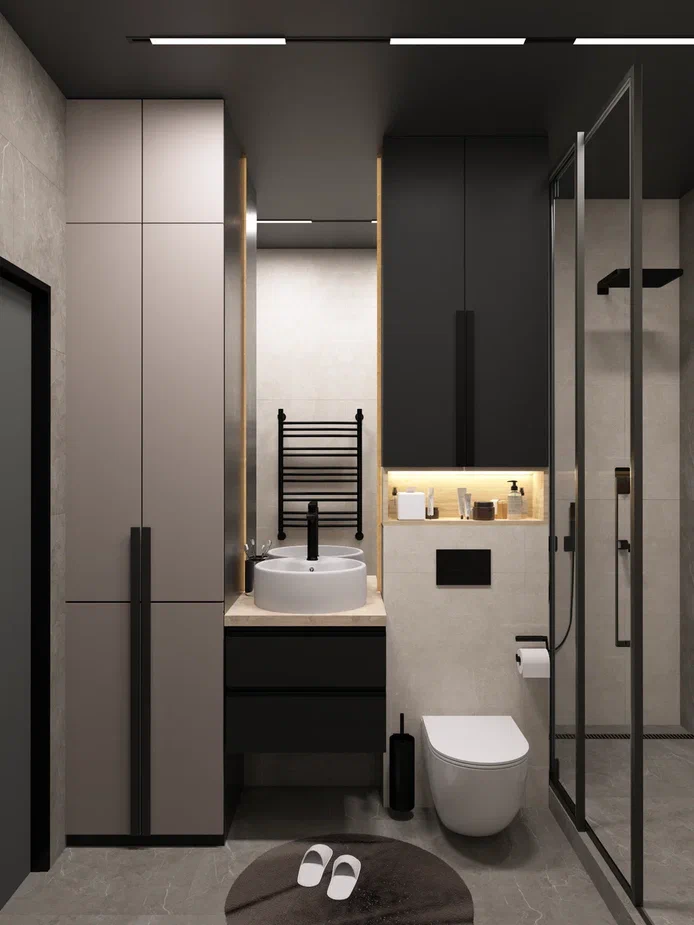 Многие привыкли видеть шкафы-купе в спальнях и коридорах, но никак не в ванных комнатах. Однако это классный и вместительный вариант, который заменит сразу все системы хранения в помещении. Шкаф-купе подойдет для больших комнат, так как занимает довольно много места. В такой мебели можно спрятать и вещи, и бытовую технику, тем самым освободив еще больше места.