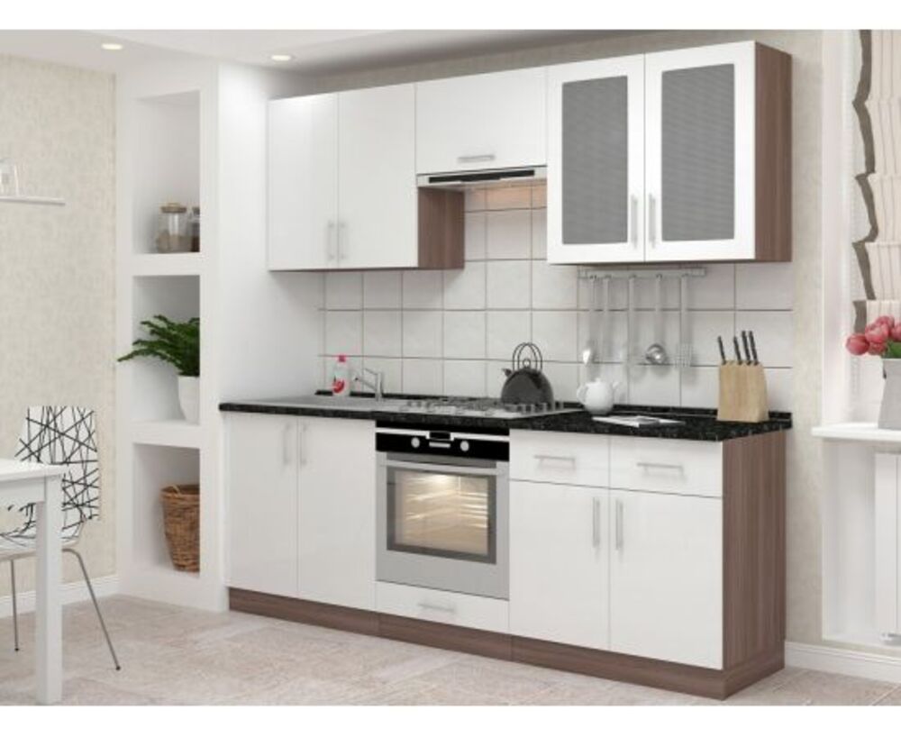 Если угловой гарнитур не помещается на вашей кухне, можно выбрать самый компактный вариант, состоящий из пары-тройки шкафов и занимающий всего одну стену комнаты. В этом случае его тоже следует оборудовать дополнительными секциями до самого потолка, иначе места для посуды может не хватить.