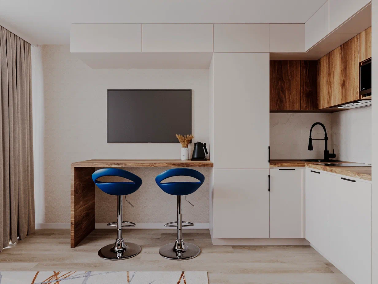 Если у вас маленькая кухня, то и холодильник обязан быть компактным. Конечно, вы не сможете хранить там большие запасы продуктов и вам придется частенько ходить в магазин, зато еда не будет залеживаться и портиться. А холодильник скромно поместится за створкой одного из нижних шкафчиков рабочей зоны.