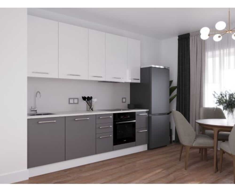 Это привычный и довольно-таки распространенный вариант для кухонь среднего размера. Холодильник помещают в высокий пенал, который располагают на одном крае кухонного гарнитура. Большими габаритами пенал ломает композиционную симметрию помещения, и, чтобы ее восстановить, надо добавить либо ряд навесных шкафчиков, либо такой же пенал на другом конце гарнитура. Иногда уравновешивающую функцию выполняет плоская вытяжка — вместе с плитой она создает нужную вертикальную линию.
