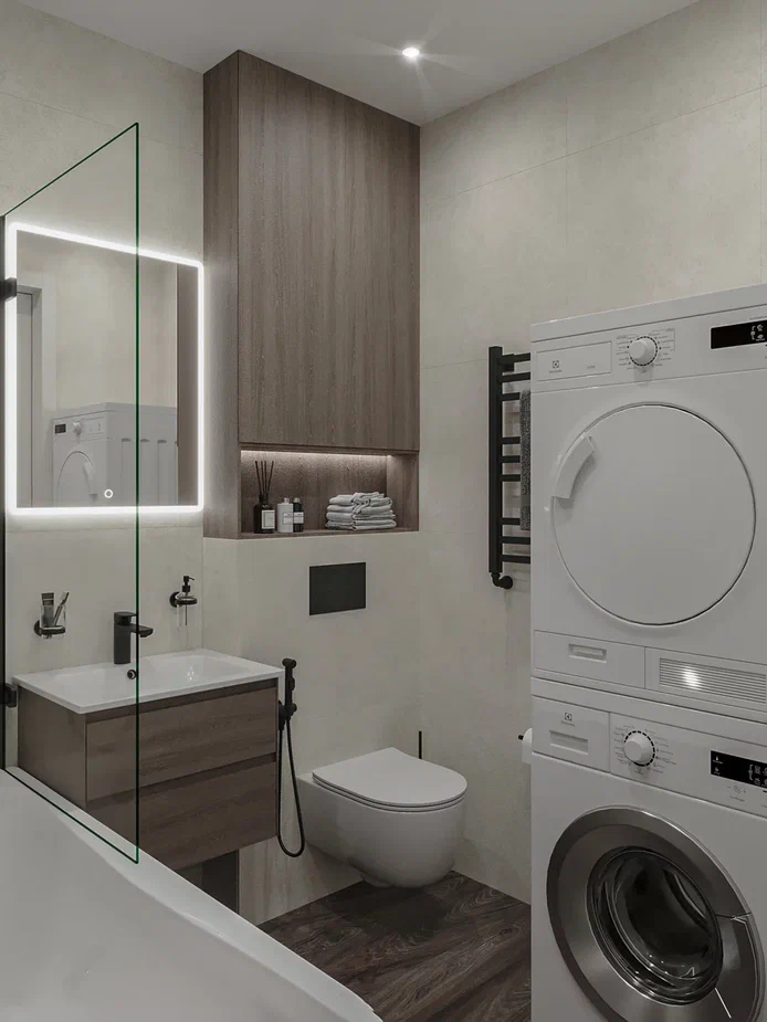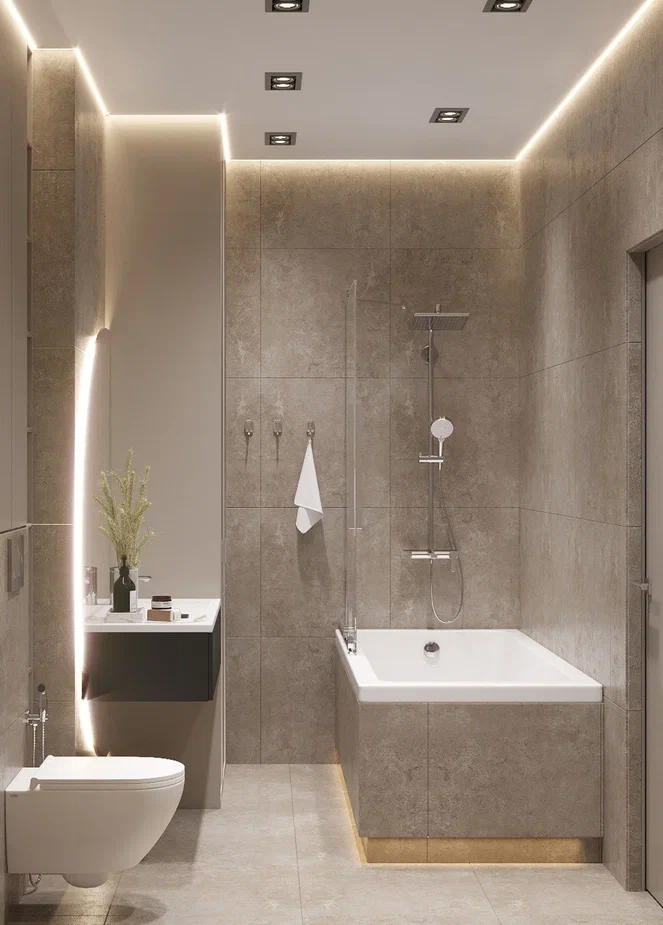 Чтобы визуально увеличить ванную, мы советуем выбирать освещение по периметру комнаты (контурное), благодаря которому создается эффект парящего потолка. Такой вариант подойдет как для больших, так и для маленьких помещений.