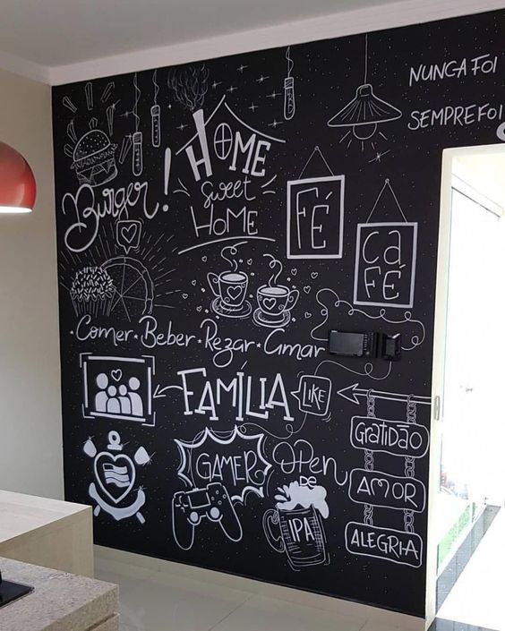 С помощью грифельной краски можно превратить стену в сплошную меловую доску: на ней можно писать или рисовать мелками. В детской комнате такая краска поможет разнообразить круг занятий ребенка и обезопасит от детских рисунков обычные обои. Популярна она также как оформление кухни или кабинета, используется в дизайне офисов. Для грифельной краски характерны в основном темные цвета, самый популярный из которых — черный. Поэтому используют ее чаще всего для частичной отделки, чтобы не слишком «затемнять» интерьер комнаты.