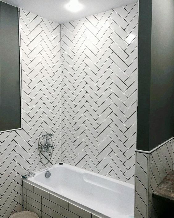 Один из фаворитов — способ укладки плитки «кабанчик» традиционной елочкой. Его можно применить на акцентной стене. Можете не беспокоиться насчет интерьерных трендов — такой метод не выйдет из моды никогда!