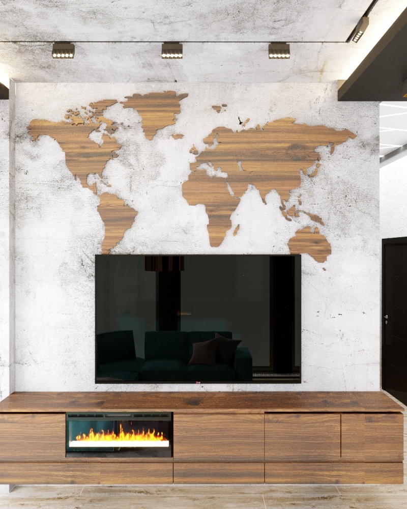 Дерево — отличный материал для украшения экоинтерьера или строгого минимализма. Панно, стилизованное под карту мира, можно разместить не только в гостиной, но и в детской комнате.