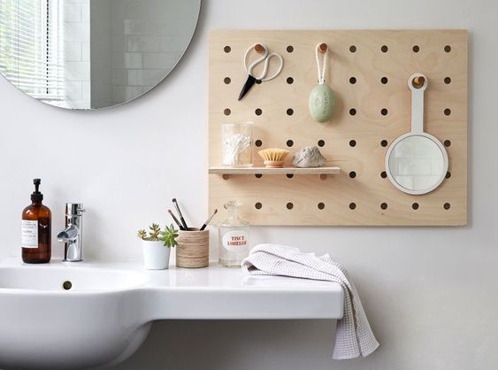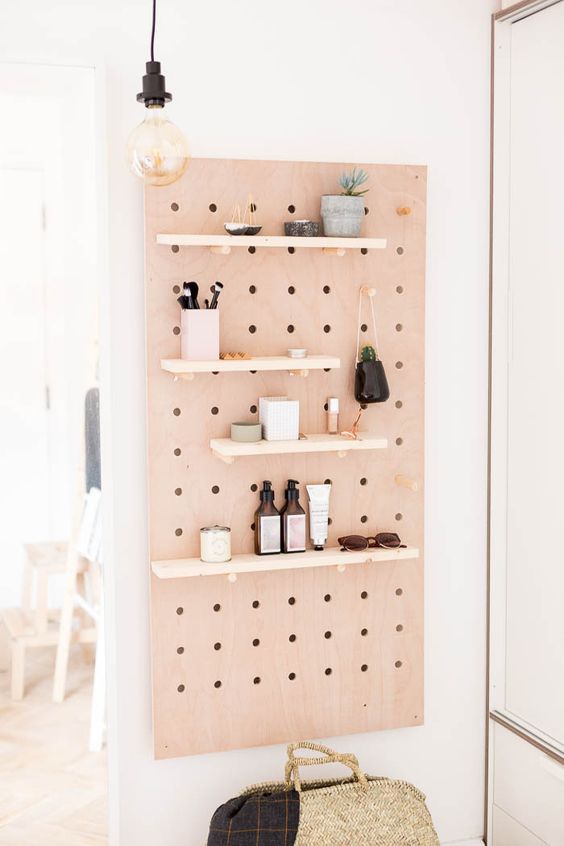 Самый очевидный способ использования настенной доски — создать на ней многочисленные полочки. Выбирайте пегборды разных цветов и форм для создания стильного интерьера.