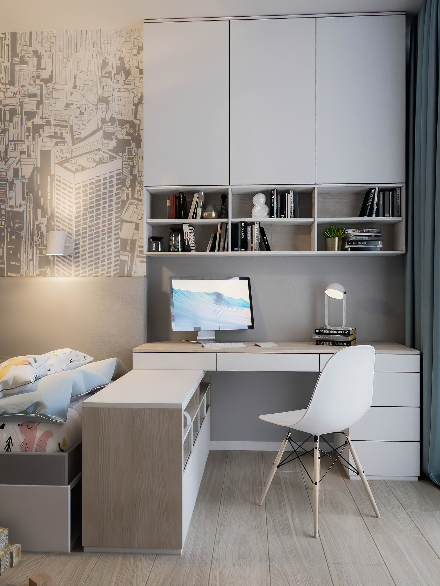 Встроенный стол для школьника для дома — тоже неплохое решение, так как он способен выполнять несколько функций. Это может быть продолжение подоконника или элемент многофункциональной мебельной конструкции. Такой стол проще всего вписать в стиль интерьера, так что о нем нужно подумать на этапе планировки комнаты.