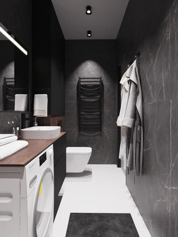 Черный, графитовый, бурый смотрятся дорого и изысканно. Интерьер приобретает настроение роскоши, элегантности и торжественности. Пример из проекта ReRooms для ванной:
