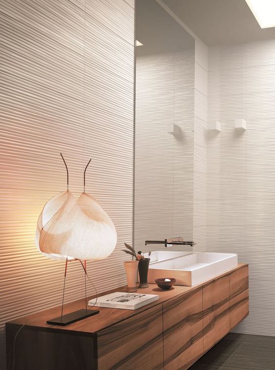 Такая отделка всегда смотрится роскошно — и в любой палитре. Можно выбрать плитку под ткань для оформления ванной комнаты или гостиной.