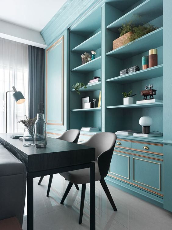 Очень необычное и редко встречающееся сочетание, так как многие опасаются использовать черный цвет, боясь, что испортят весь внешний вид комнаты. Опасения не напрасны, так как тут действительно можно увлечься и испортить интерьер. Однако если подойти к выбору отделочных материалов и декора обдуманно, все получится. Используйте только один вид декора черного цвета, например рамки для фотографий. Смотрится кабинет очень благородно и насыщенно. Для спальни можно приобрести черное постельное белье, а большую часть мебели — в оттенке тиффани.