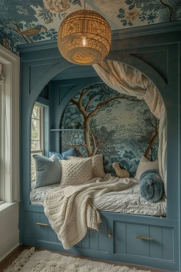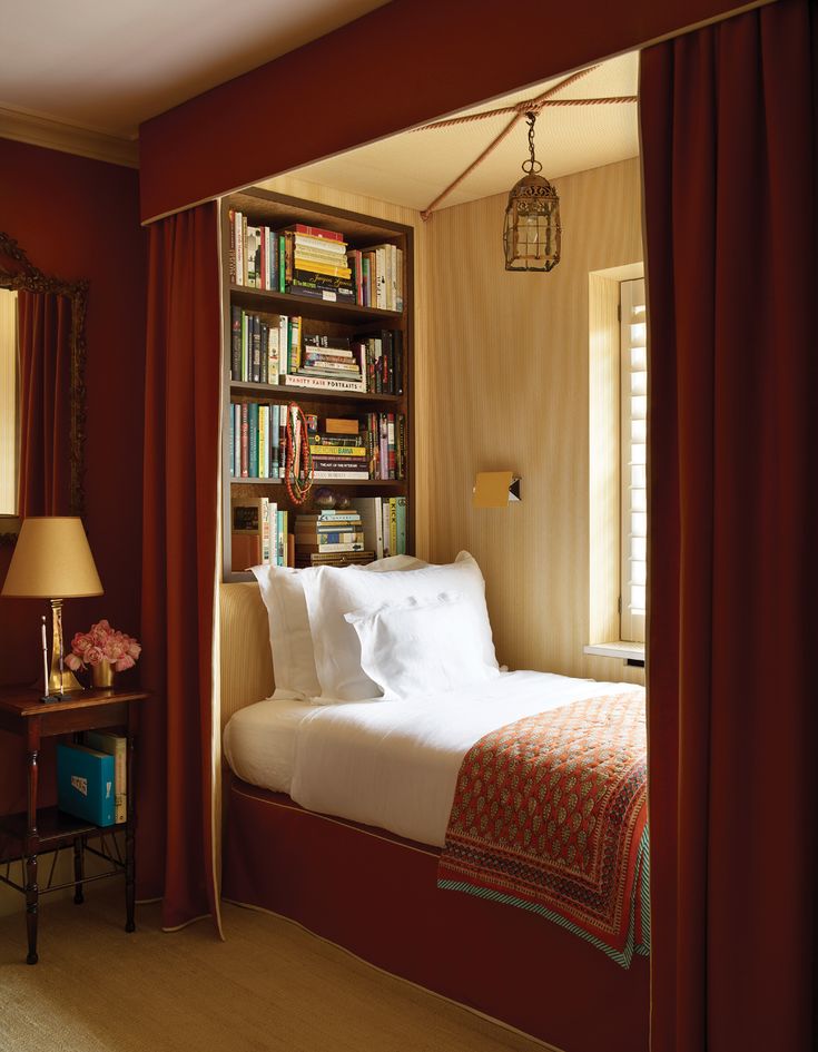 Альков можно создать самостоятельно и сделать небольшую обособленную нишу. Многие дизайнеры любят делать ее рядом с окном и создают в ней уютное спальное место. Если решитесь на такой дизайн, постарайтесь повесить на окна светонепроницаемые занавески или рулонные шторы. По утрам яркий свет может вас будить.