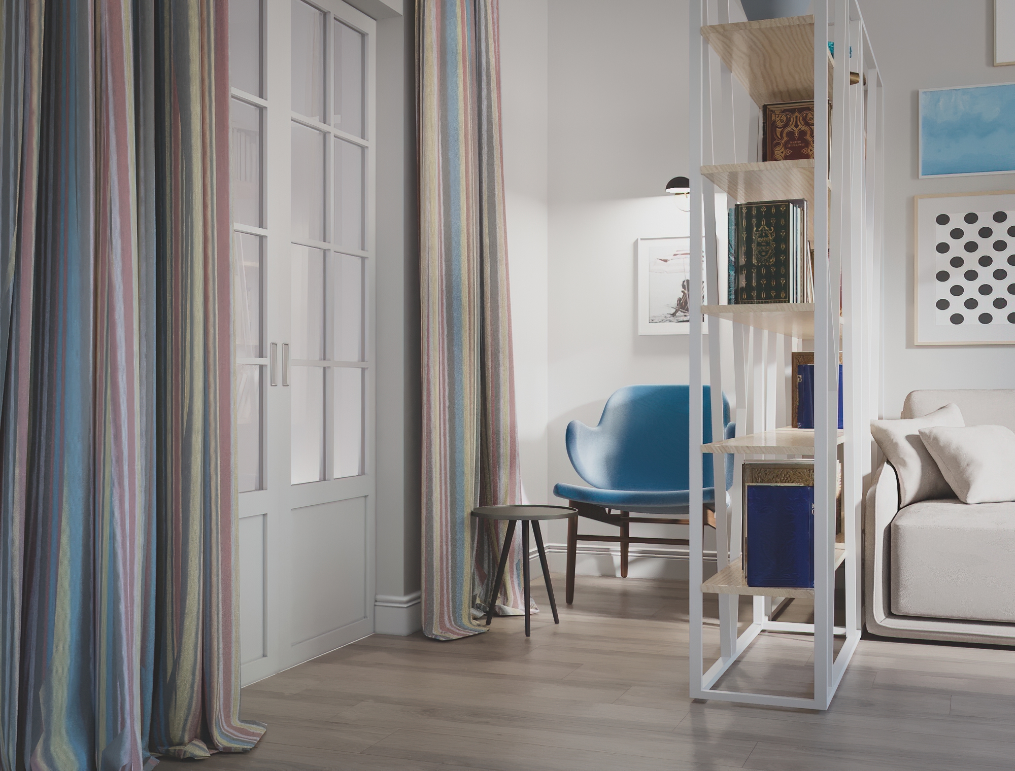 Полосы — смелый и рискованный прием в декоре комнаты. Широкие горизонтальные полосы могут немного опустить потолок, но при этом раздвинуть стены. Учитывайте это, выбирая такую ткань для декорирования гардероба.