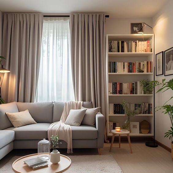 Для гостиной выбор ткани зависит от расположения окон по сторонам света. Если они выходят на южную сторону и солнце постоянно заглядывает к вам в гости, выбор лучше остановить на портьерах. Если же на северную и вам хочется наслаждаться естественным освещением — на гардинах. Люверсы подбирайте в цвет ткани или карниза.