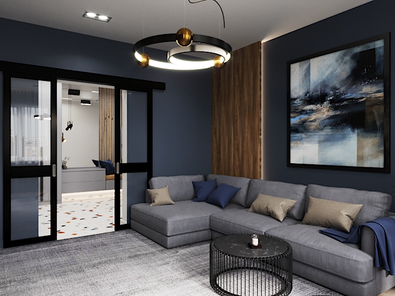 В стиле хай-тек вы почти не увидите ярких синих цветов. Для него, наоборот, характерны темные оттенки. Если хотите использовать этот стиль, выбирайте темно-синий, уходящий в серый.
