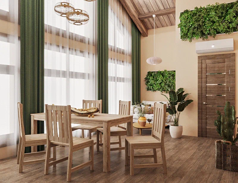 Фото ReRoomsДеревянные элементы и зеленые оттенки здорово комбинируются с белым цветом. Он разбавляет яркие краски, поэтому лучше применять его в разных частях комнаты, в виде мебели или отделки, чтобы равномерно вписать белые детали в интерьер.