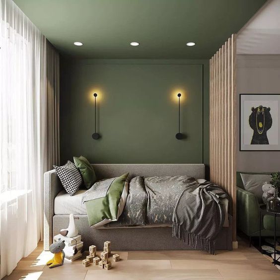 Фото PinterestВ комнате мальчика попробуйте сочетание зеленого и синего цвета. В интерьере маленького помещения чередуйте эти цвета, иначе один из них может захватить почти все пространство.