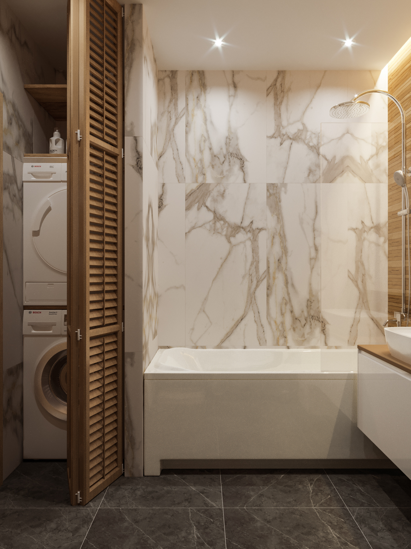 Конечно, дорогой мрамор доступен не всем, но акцентную стену под мрамор можно сделать при помощи плитки, обоев или краски. Необычная керамическая плитка на одной из стен в ванной комнате обязательно будет привлекать внимание гостей.