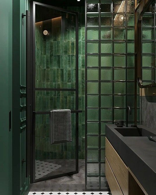 Лучше использовать плитку с ярким узором для акцента. Эта ванная комната сочетает сдержанность и экстравагантность. Плитка насыщенного зеленого цвета удачно контрастирует с основным белым цветом.