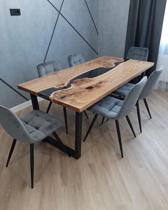 Основа у такого стола тоже деревянная, но ее украшает прозрачная застывшая эпоксидная смола с красивым глянцевым эффектом. Эта оригинальная деталь сделает самобытное украшение даже из обычного стола традиционной прямоугольной формы. Самый популярный вариант такого оформления — волнистая полоса из эпоксидной смолы по всей длине столешницы.