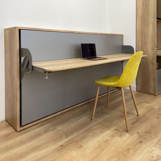 Практичный способ разместить в небольшой комнате рабочее место и кровать — подобрать трансформер с подходящим механизмом или сделать проект мебели на заказ. Некоторые модели столов-кроватей при трансформации даже позволяют не убирать компьютер и рабочие принадлежности со стола: при помощи подъемного механизма стол легко поднимается над спальным местом и при этом с него ничего не падает.