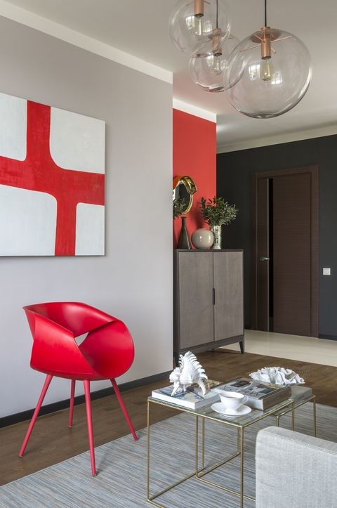 Серый оттенок может преобладать над красным — небольшой акцент яркого доминирующего цвета будет заметен в помещении, будь оно даже все выполнено в оттенках серого.