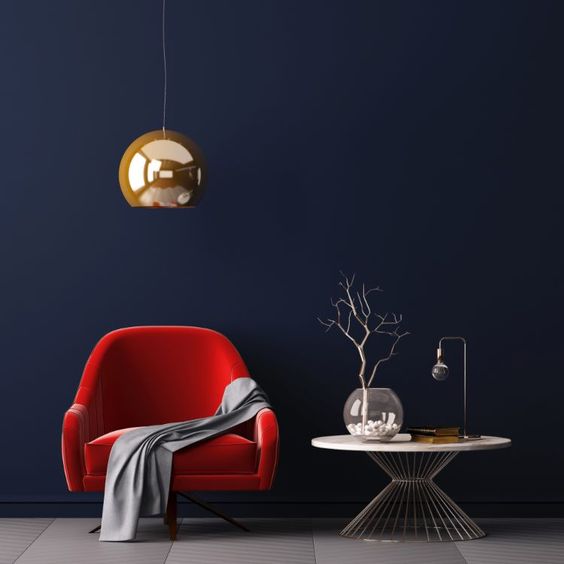Темно-красная мебель на фоне темно-синих стен — это классическая цветовая комбинация, которая громко заявляет о своей элегантности.