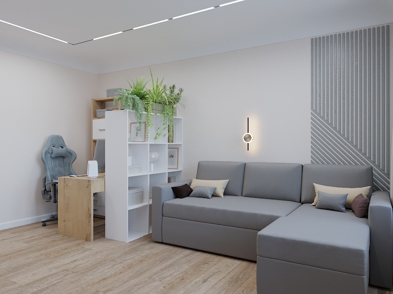 Это строгий, элегантный интерьер, предусматривающий исключительно функциональные, практичные и долговечные вещи. Прямой диван немаркого цвета и без декора идеально впишется в такую комнату.