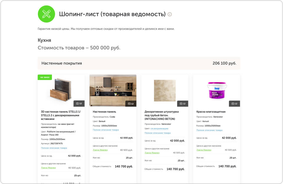 В результате вы получите полную товарную ведомость с перечнем всех товаров, которые вам понадобятся для воплощения дизайн-проекта. И на все эти товары мы сможем сделать вам скидку