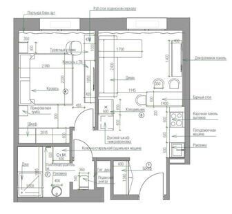 Интерьер этой двухкомнатной квартиры оформлен в современном ключе: гармоничная цветовая палитра придаёт пространству свежий и стильный вид. Оригинальные архитектурные детали, разнообразие текстур и необычные световые акценты органично сочетаются, создавая цельную и продуманную концепцию.